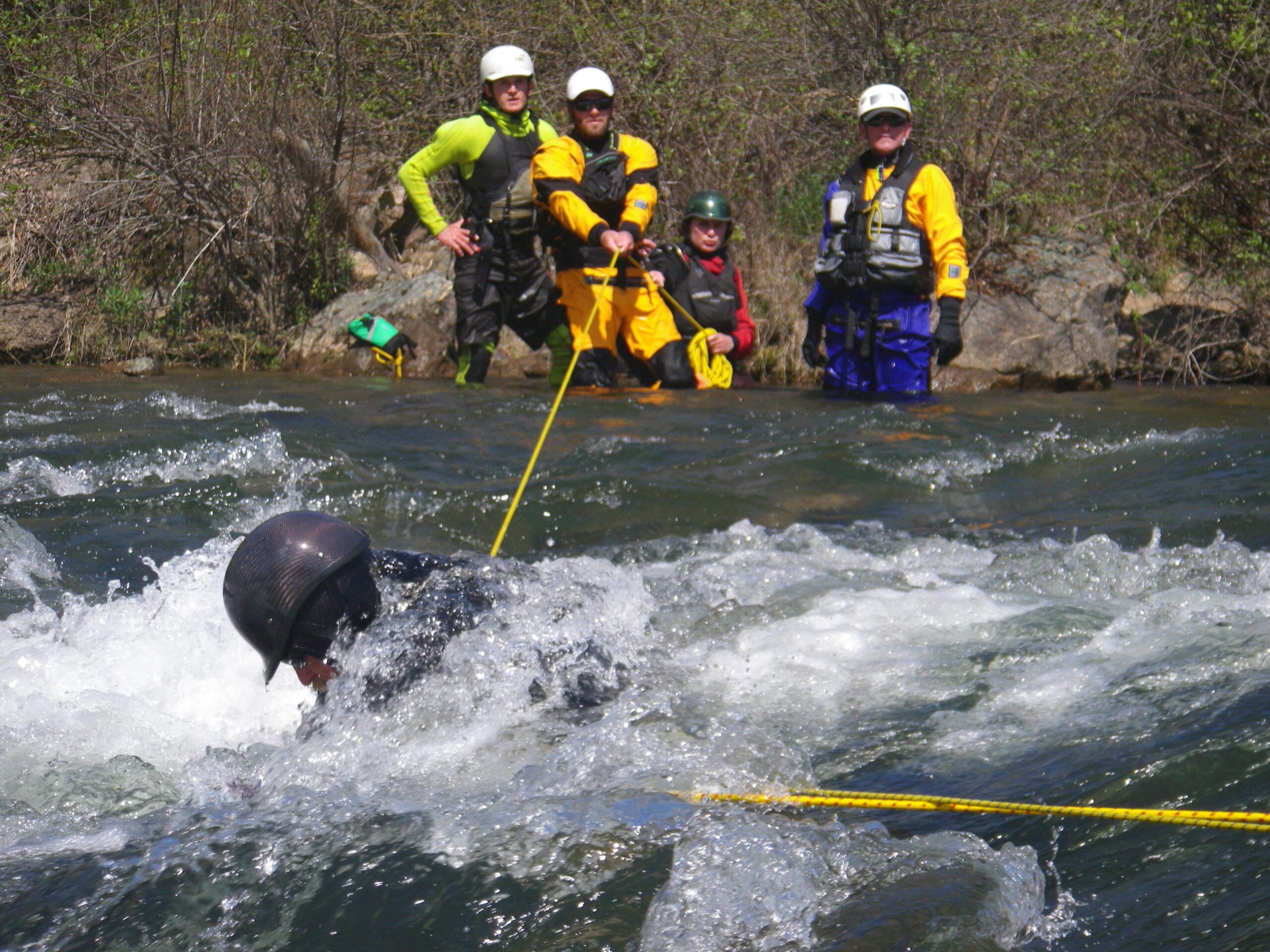 —- rescue progressions including upstream spotters, downstream back-up, leader, rescuer, medic
